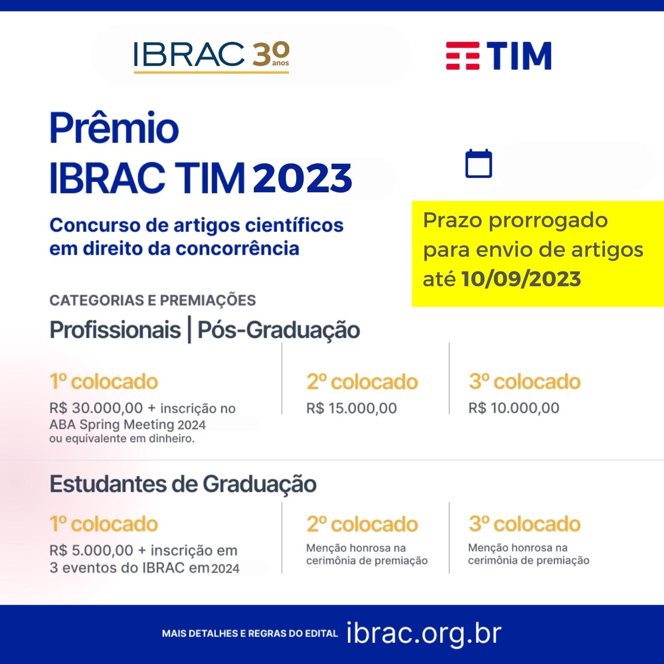 O Instituto Brasileiro de Estudos de Concorrência, Consumo e Comércio Internacional (“IBRAC”), com patrocínio da TIM S.A. (“TIM”), promoverá o Concurso de Artigos Científicos sobre Defesa da Concorrência (“Concurso IBRAC-TIM 2023”), nos termos do presente regulamento.
