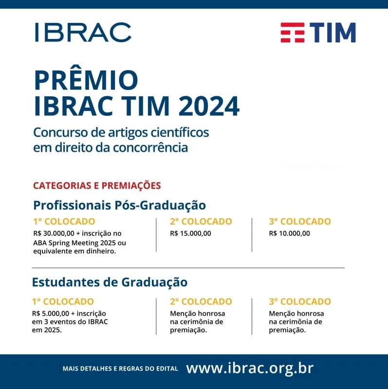 O Instituto Brasileiro de Estudos de Concorrência, Consumo e Comércio Internacional (“IBRAC”), com patrocínio da TIM S.A. (“TIM”), promoverá o Concurso de Artigos Científicos sobre Defesa da Concorrência (“Concurso IBRAC-TIM 2024”), nos termos do presente regulamento.