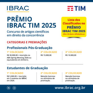 O Instituto Brasileiro de Estudos de Concorrência, Consumo e Comércio Internacional (“IBRAC”), com patrocínio da TIM S.A. (“TIM”), promoverá o Concurso de Artigos Científicos sobre Defesa da Concorrência (“Concurso IBRAC-TIM 2025”), nos termos do presente regulamento.
