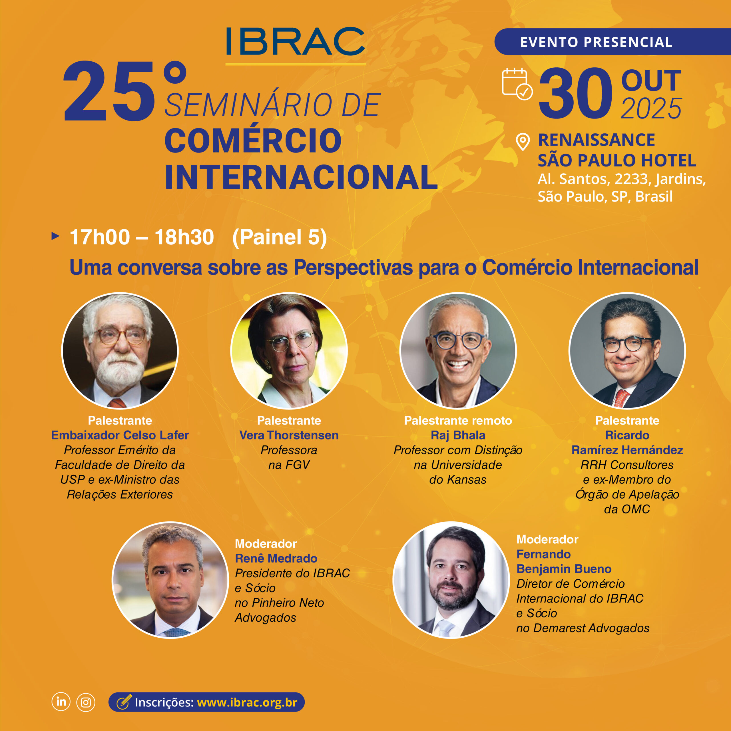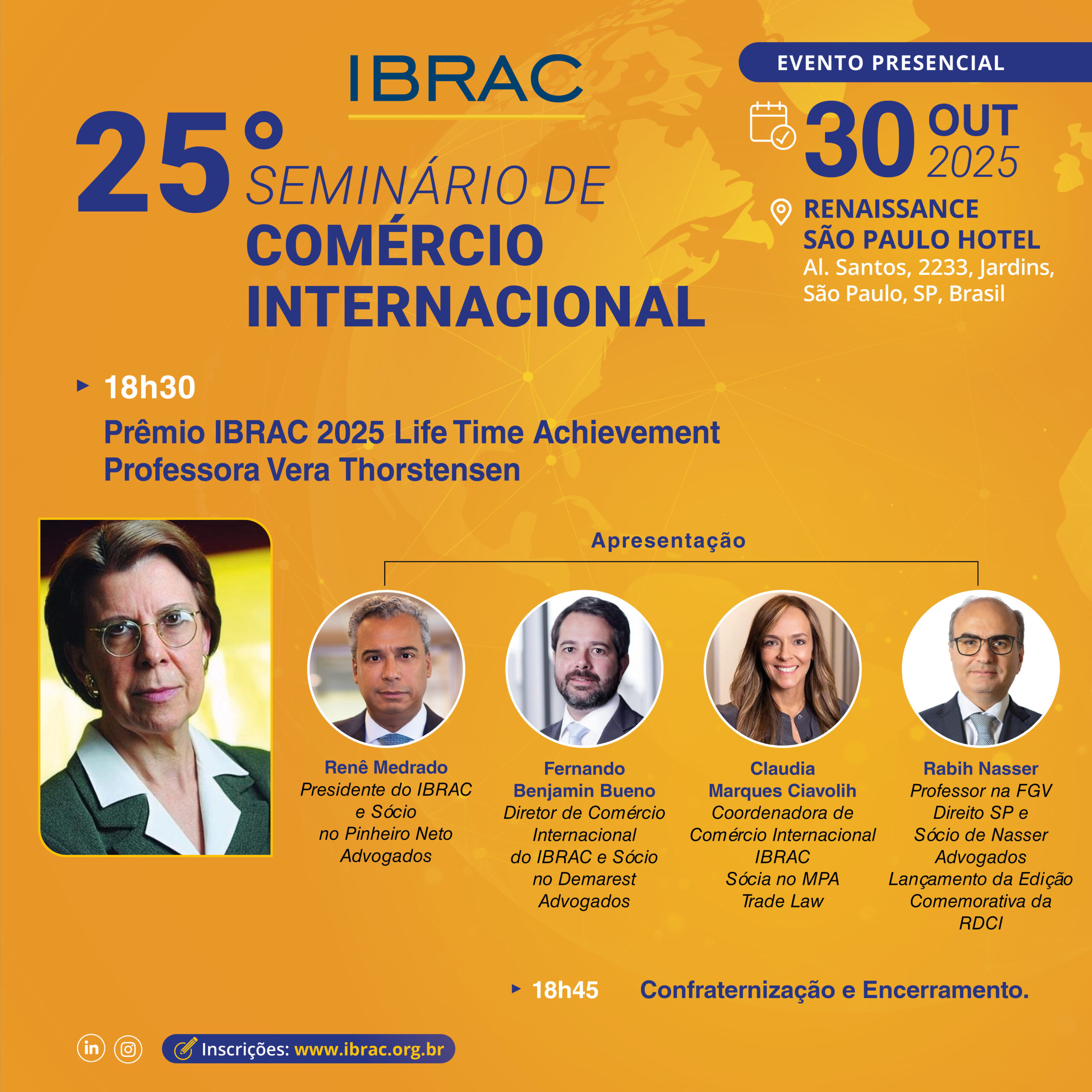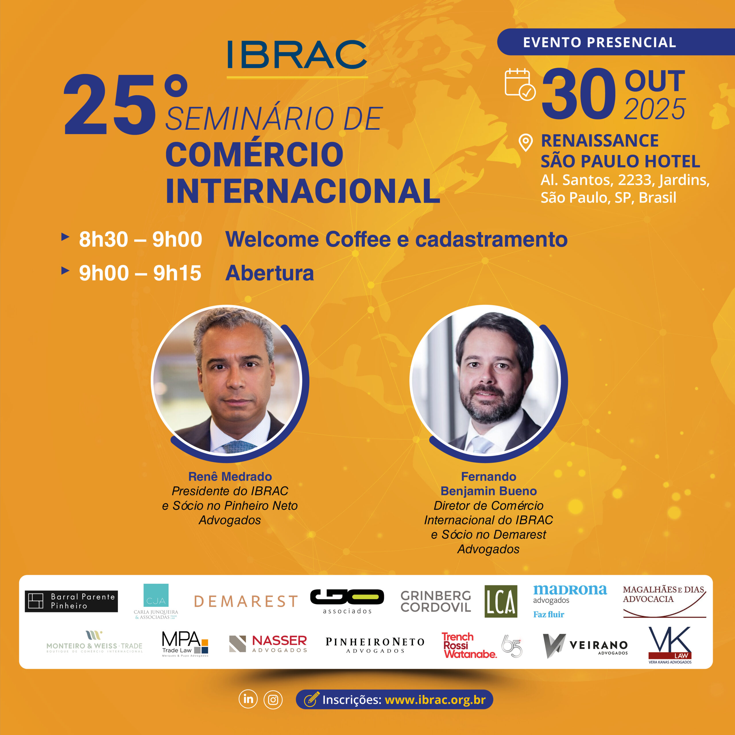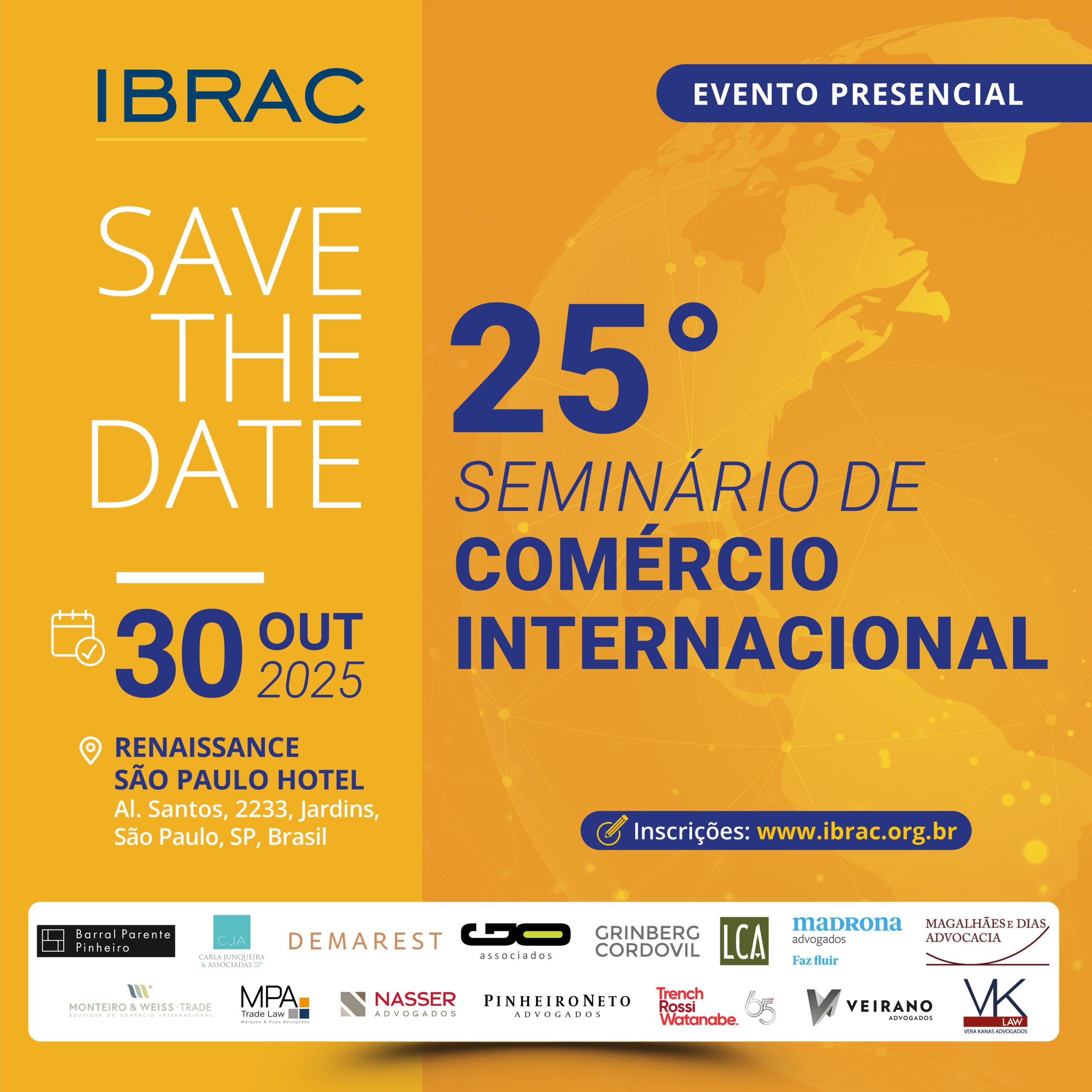 O 25º Seminário sobre Comércio Internacional (“Seminário”) será realizado no dia 30 de outubro de 2025, em formato presencial, no Renaissance São Paulo Hotel, Alameda Santos, 2233, Jardins, São Paulo, SP.