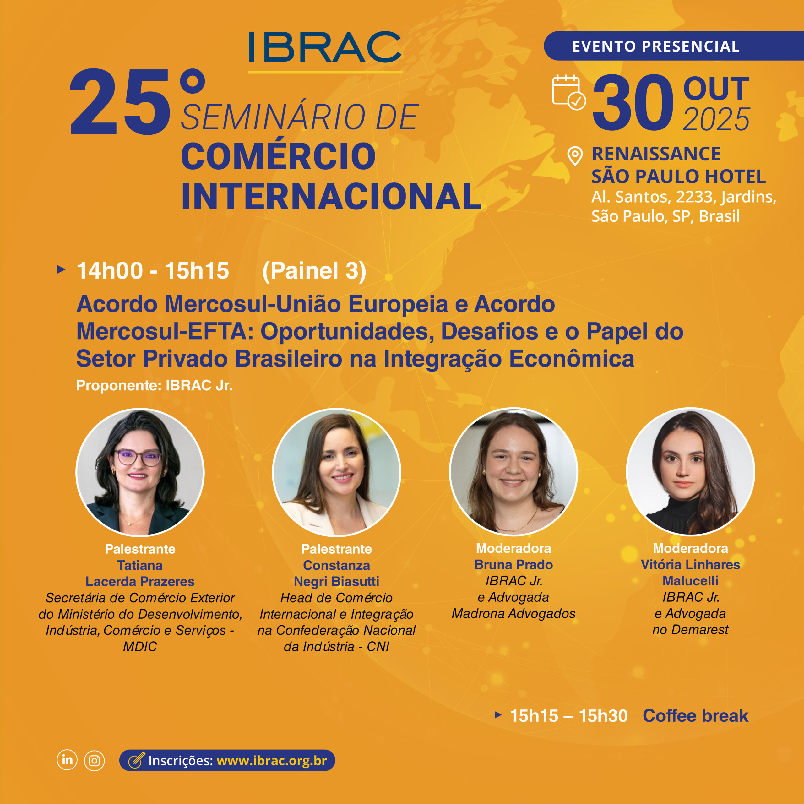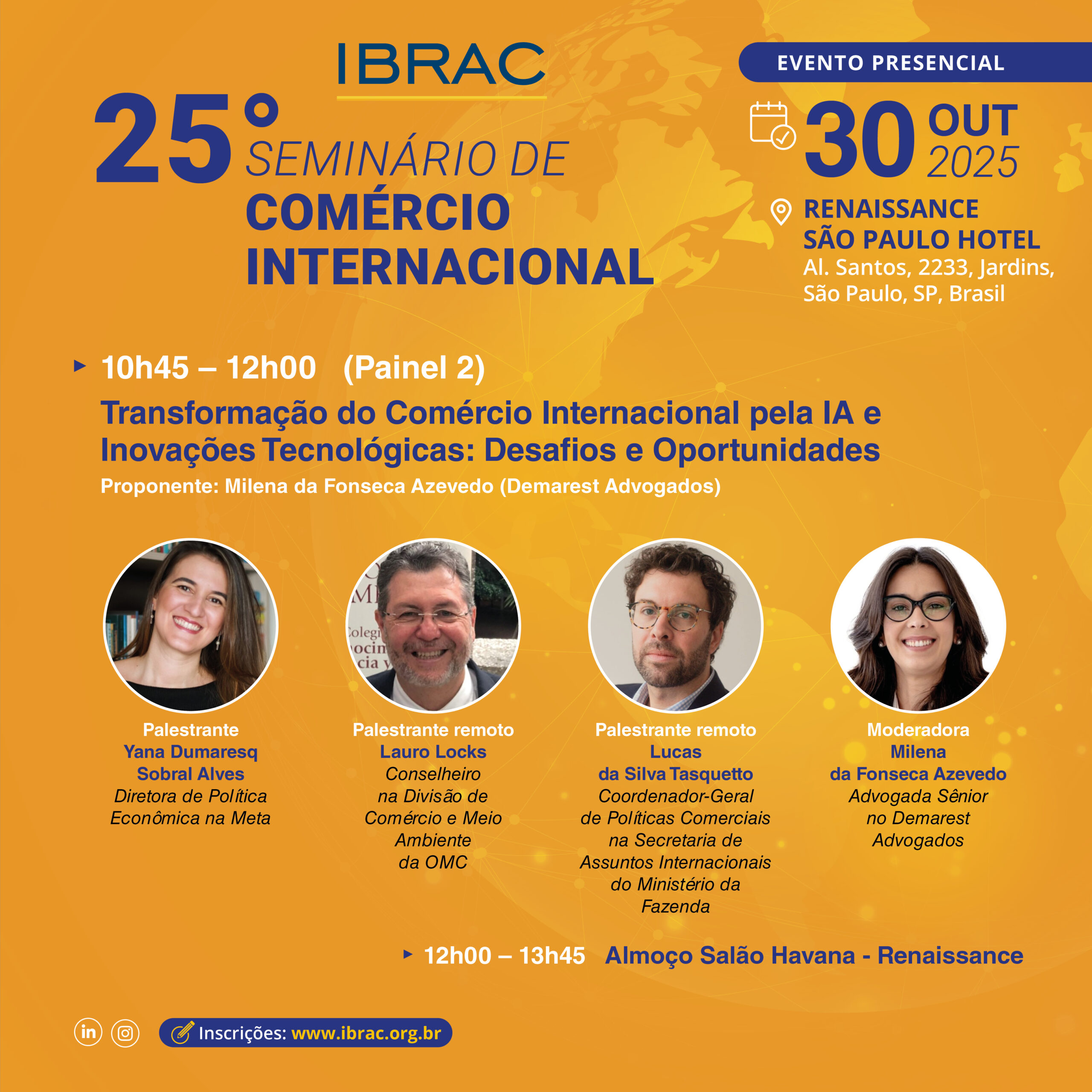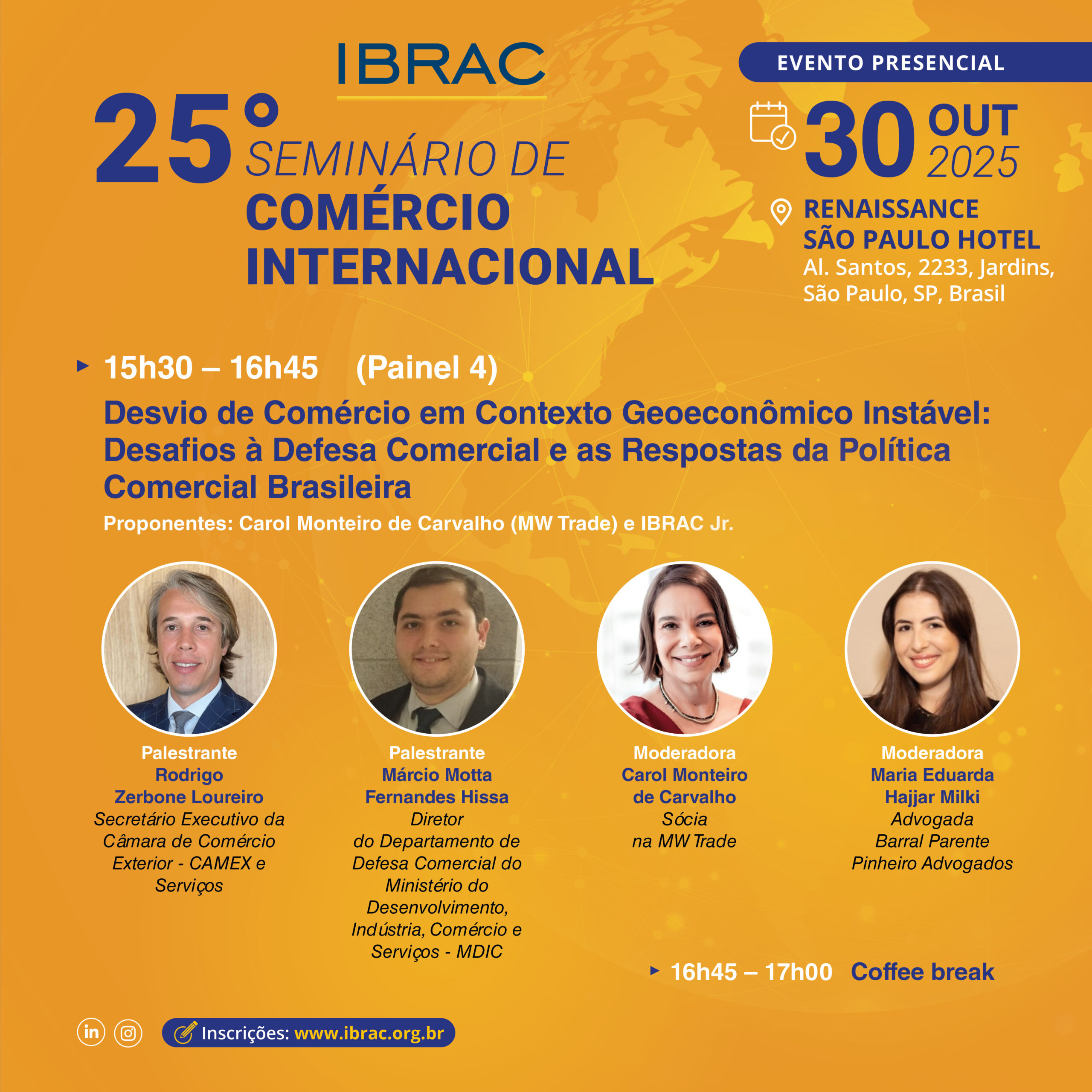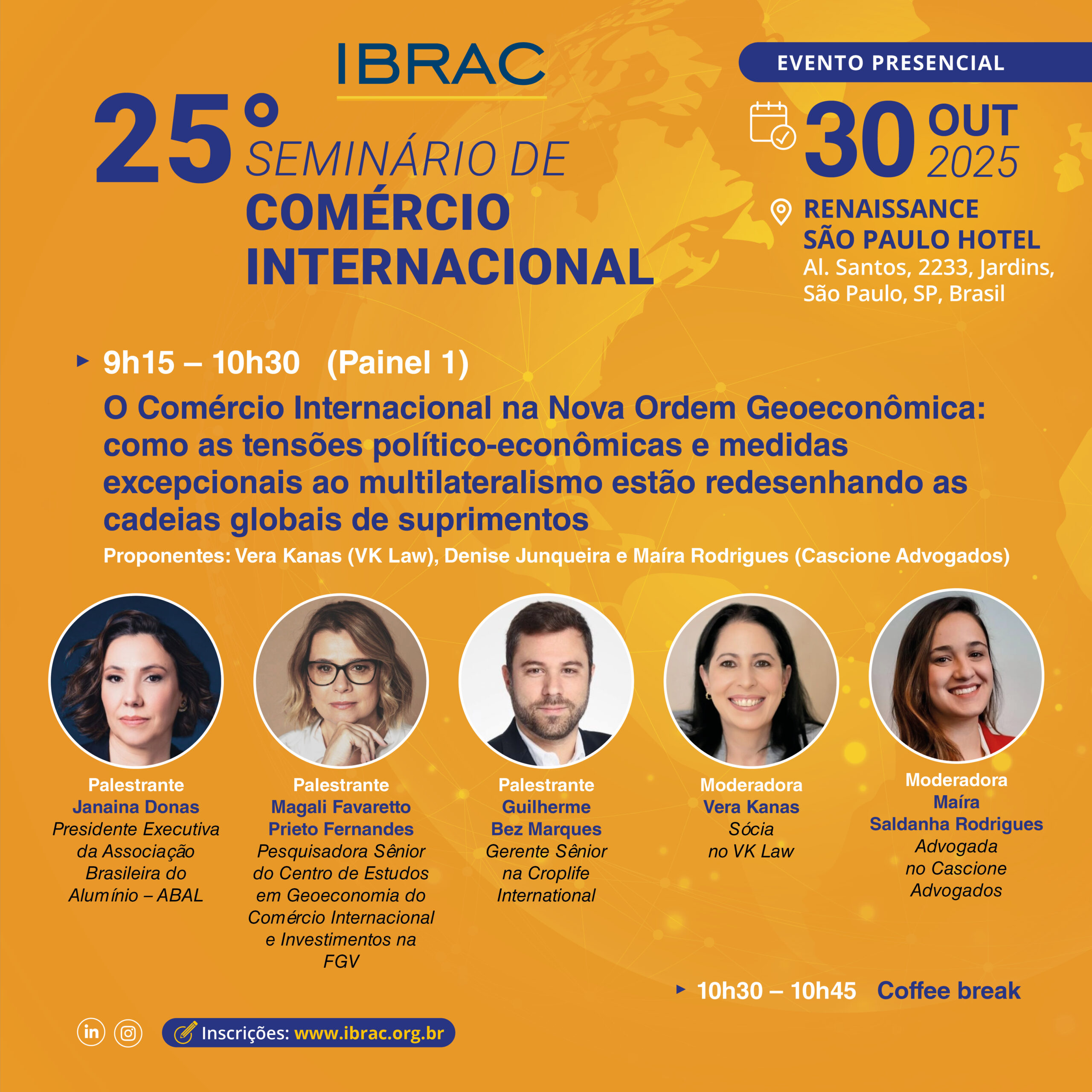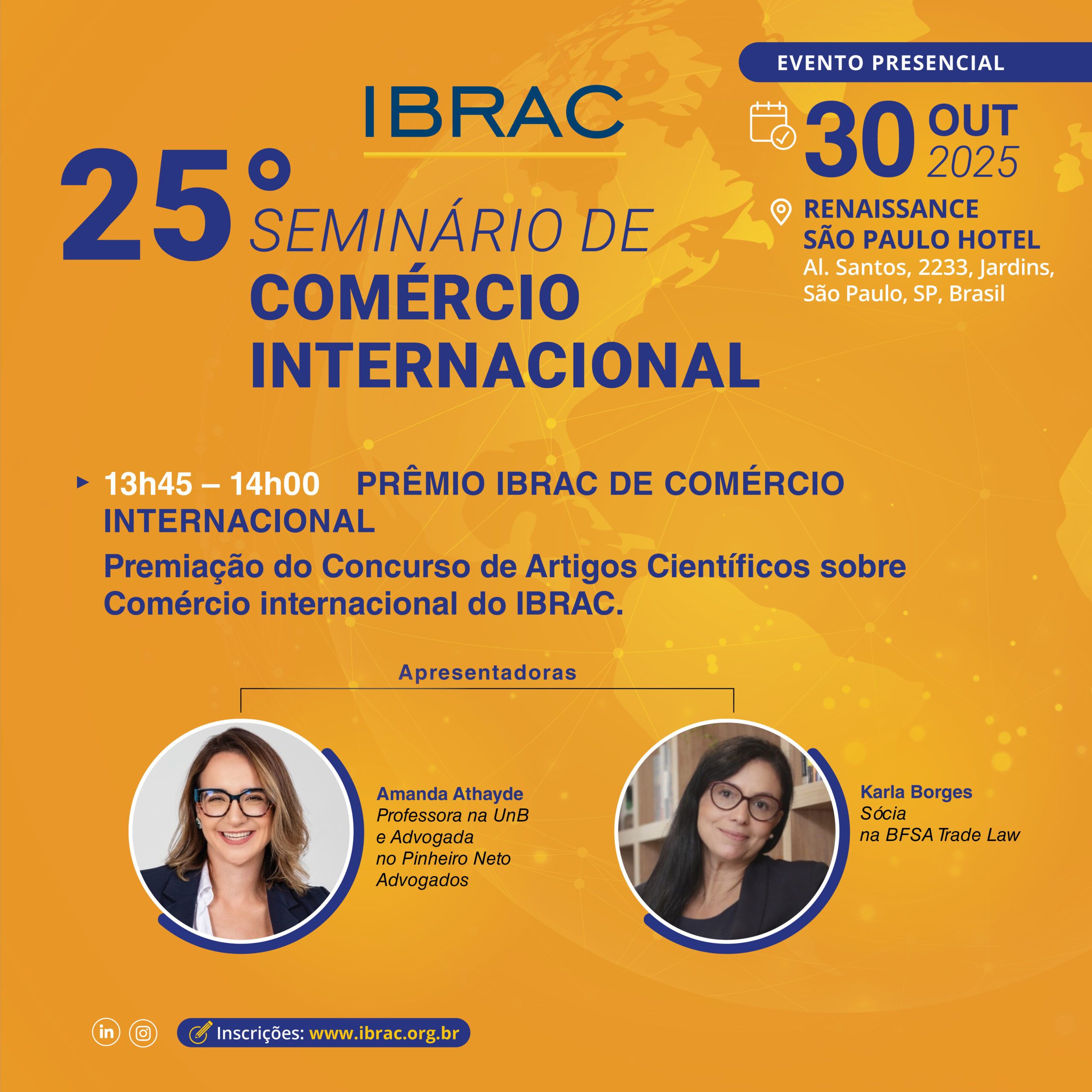 O 25º Seminário sobre Comércio Internacional (“Seminário”) será realizado no dia 30 de outubro de 2025, em formato presencial, no Renaissance São Paulo Hotel, Alameda Santos, 2233, Jardins, São Paulo, SP.