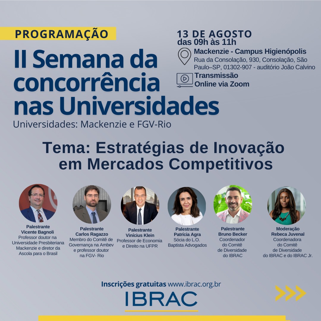 O IBRAC te convida para a II Semana da Concorrência nas Universidades. O segundo dia de evento, no dia 13 de agosto, abordará o tema “Estratégias de Inovação em Mercados Competitivos”.