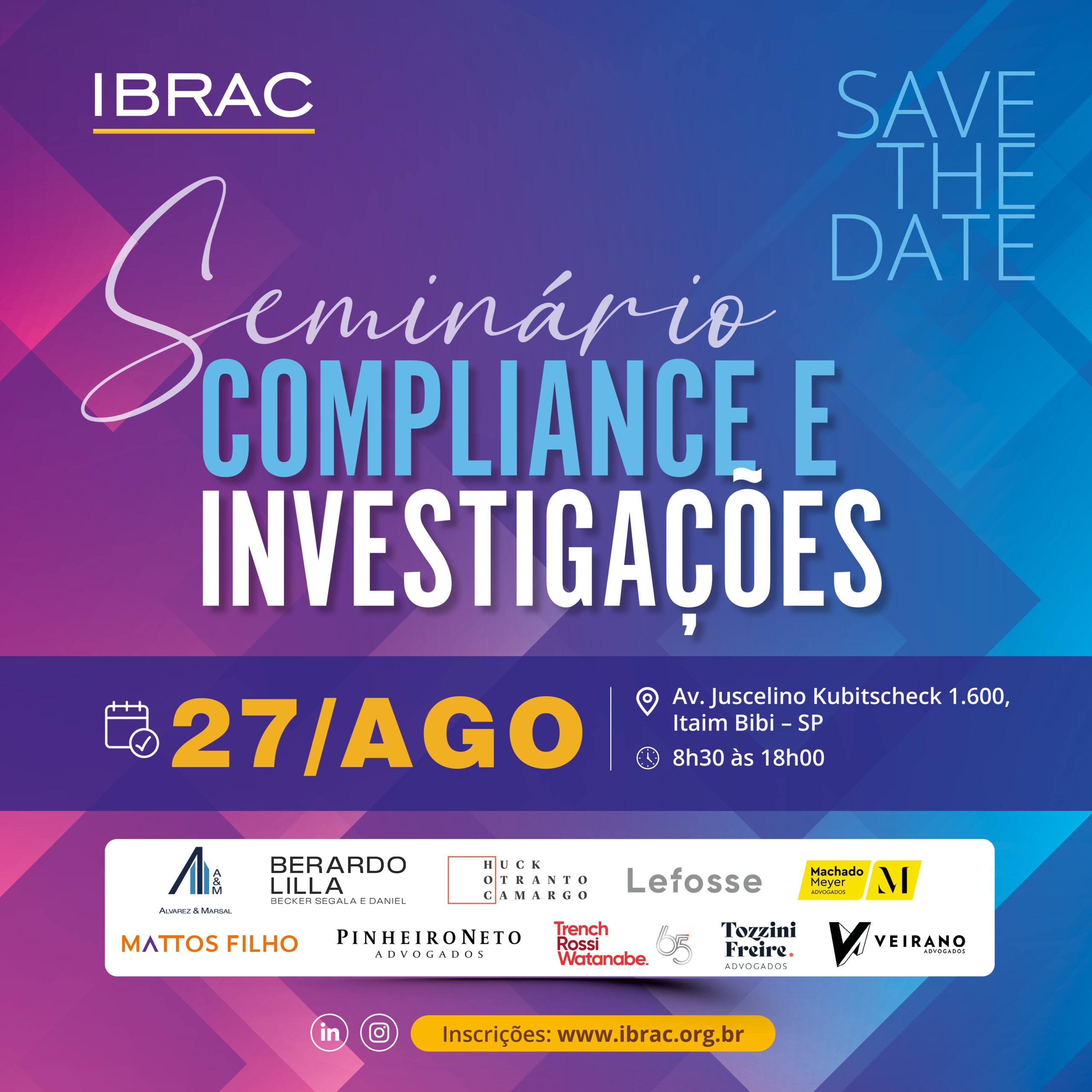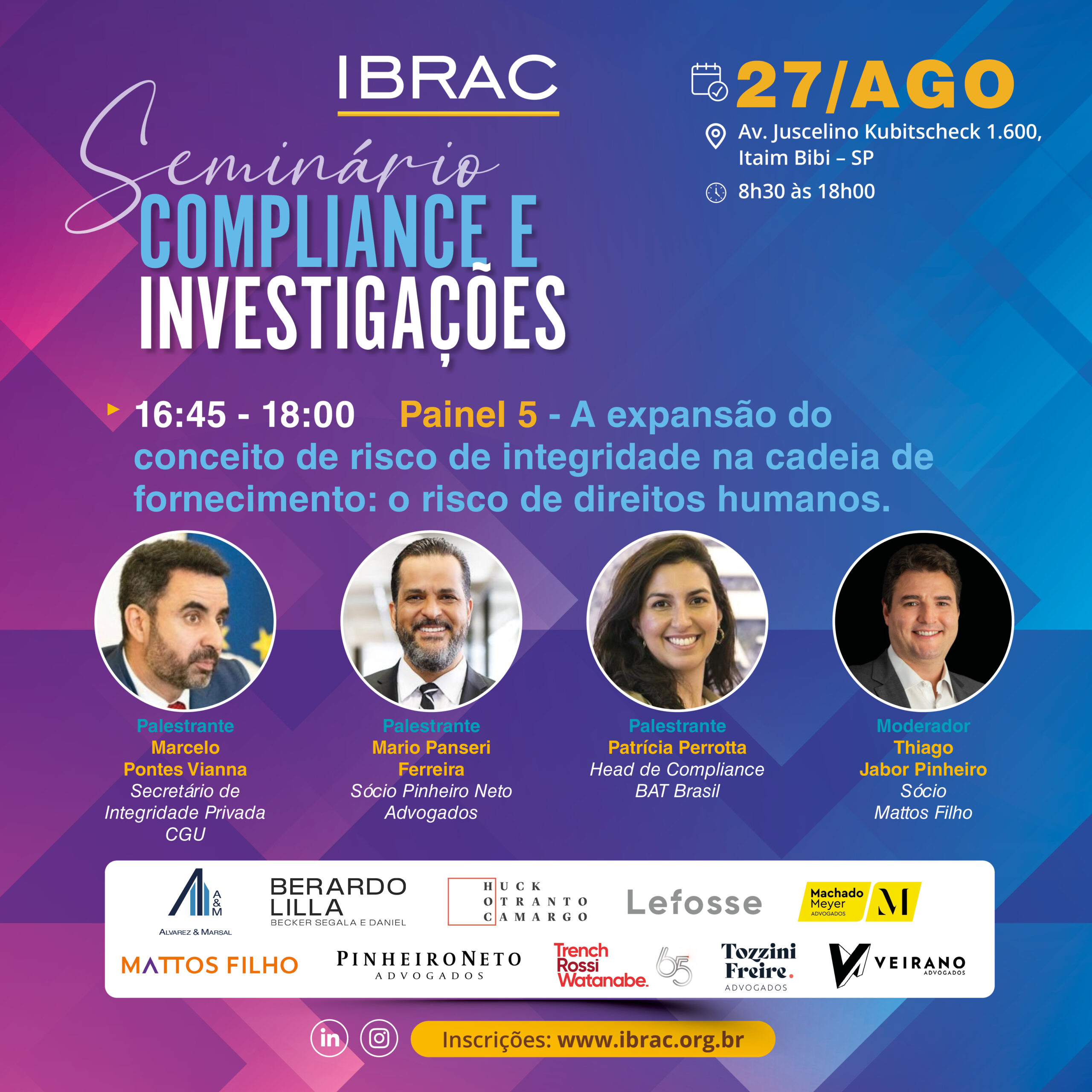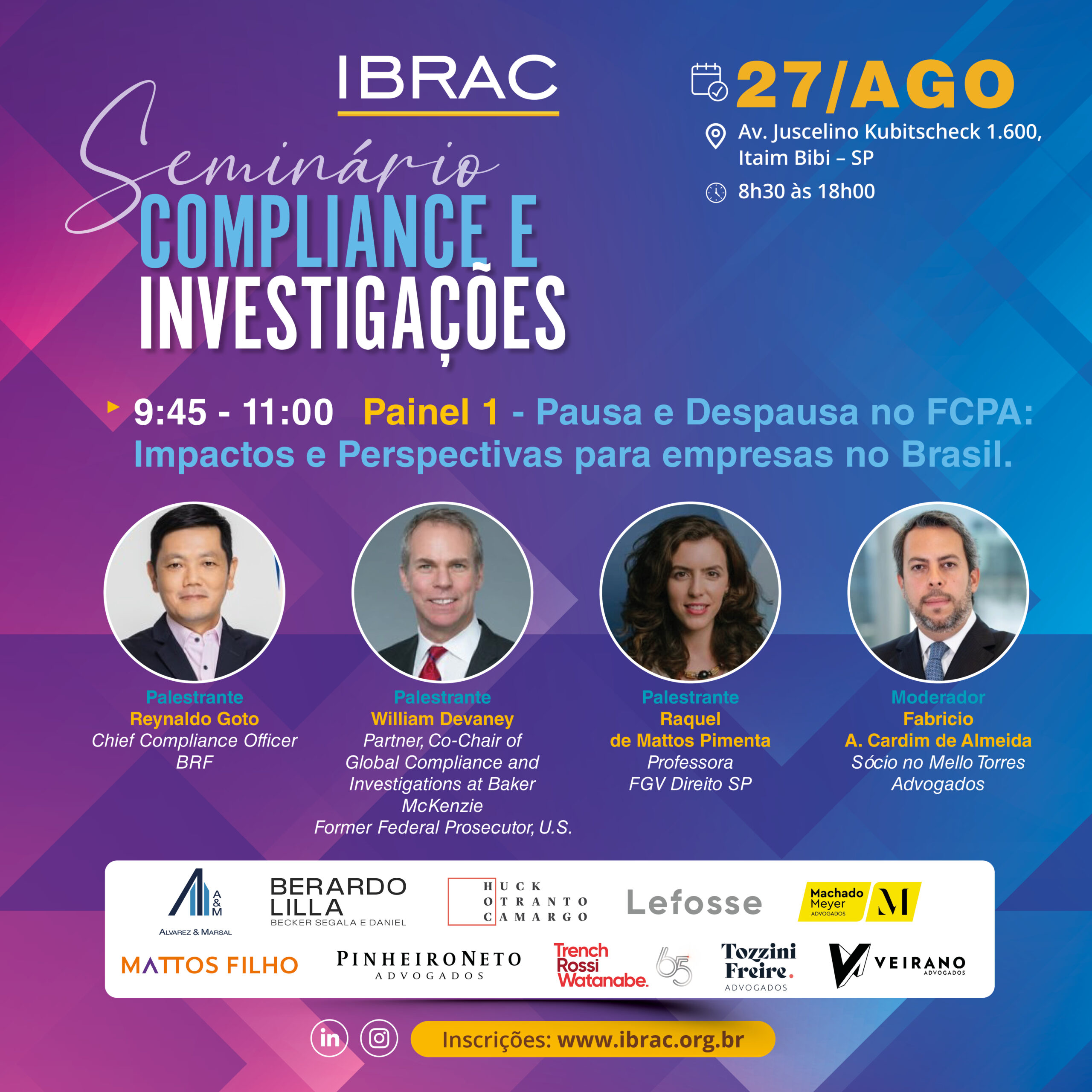 O Seminário de Compliance e Investigações é um dos eventos mais relevantes da nossa programação anual. Nesta edição, reuniremos profissionais de destaque para discutir temas atuais e estratégicos, contribuindo para o aprimoramento das normas e práticas relacionadas à integridade corporativa e à condução de investigações internas.