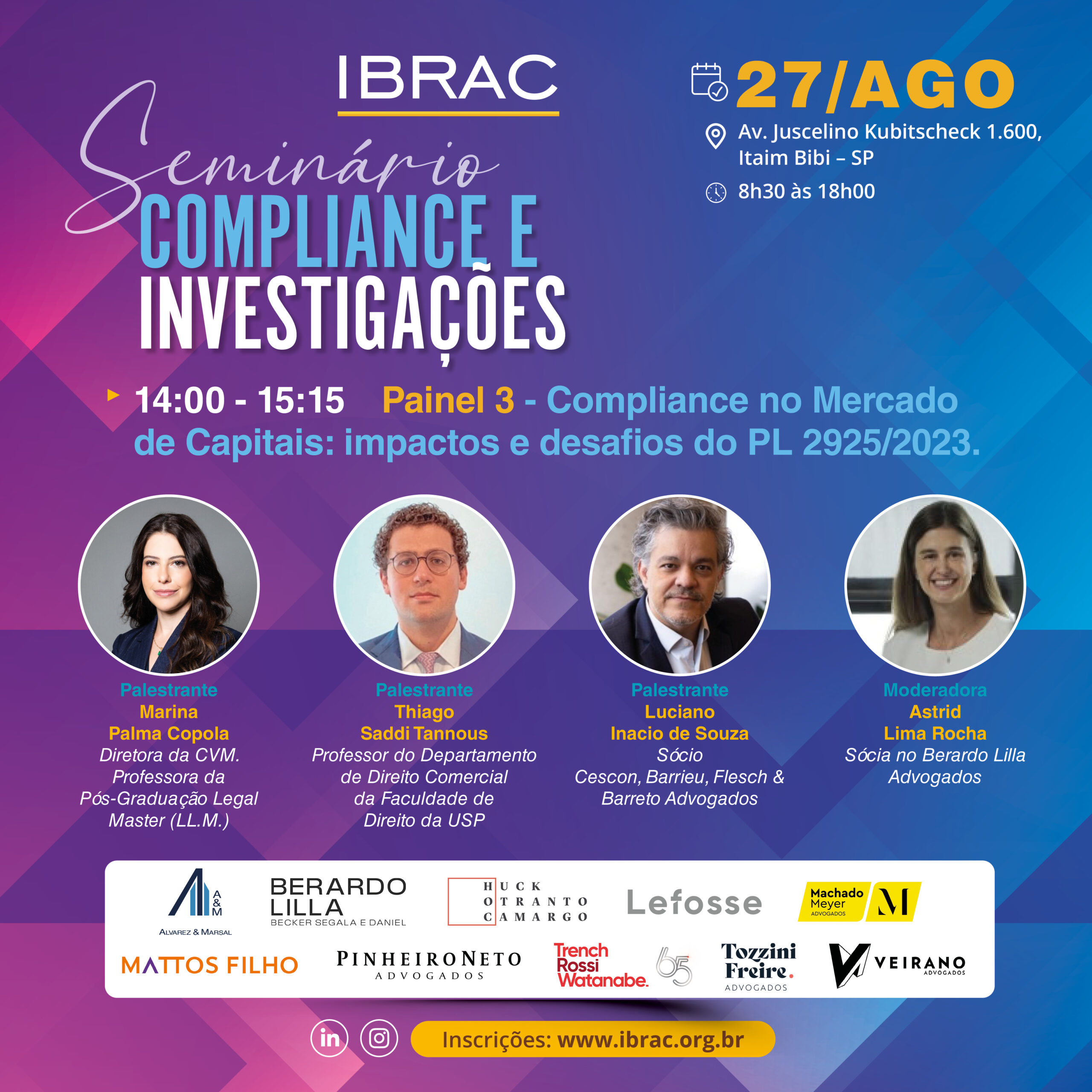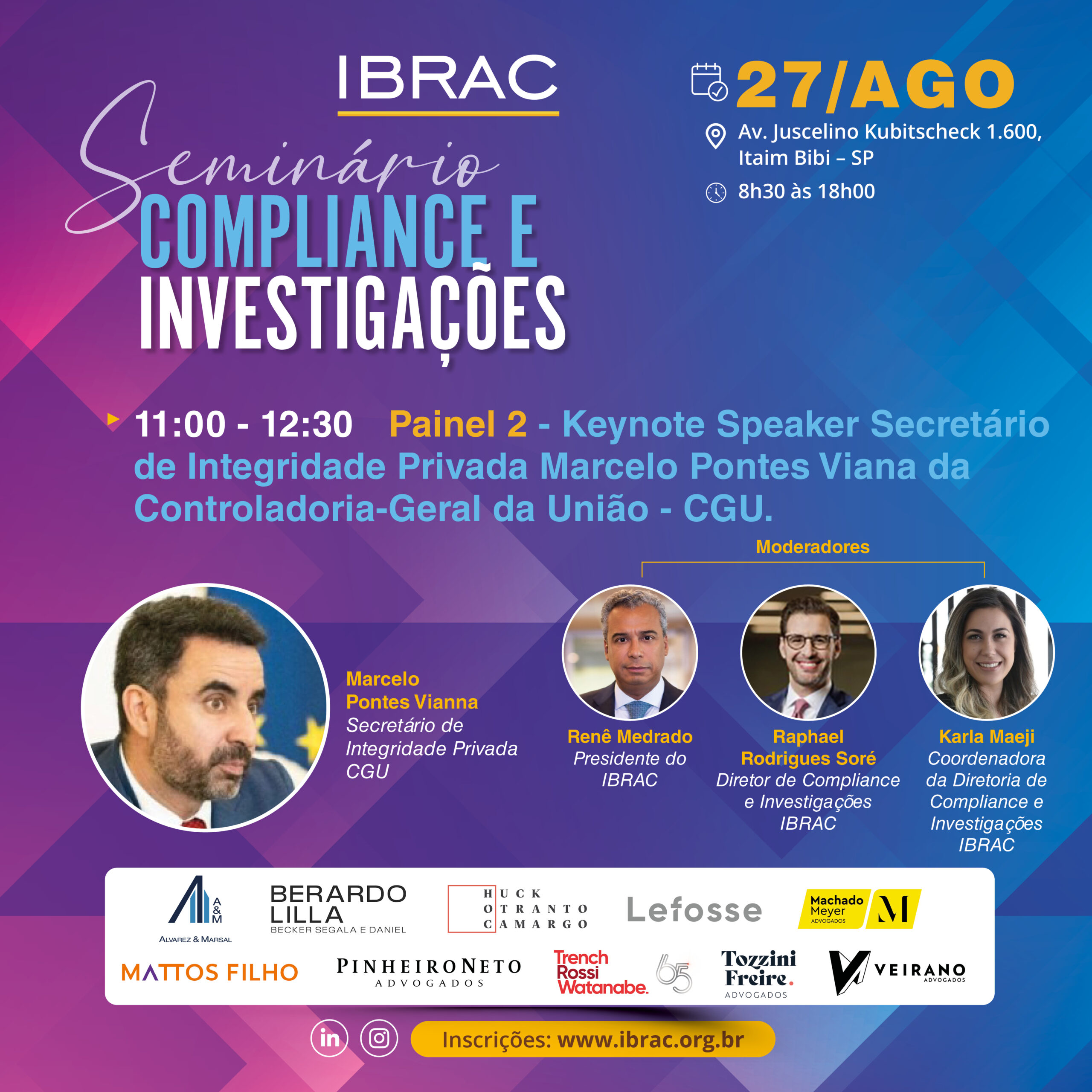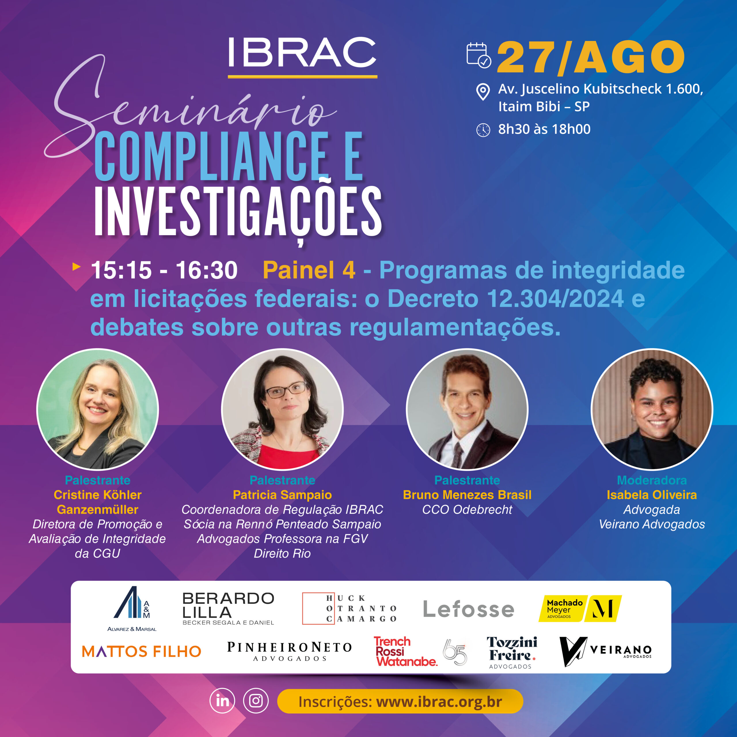 O Seminário de Compliance e Investigações é um dos eventos mais relevantes da nossa programação anual. Nesta edição, reuniremos profissionais de destaque para discutir temas atuais e estratégicos, contribuindo para o aprimoramento das normas e práticas relacionadas à integridade corporativa e à condução de investigações internas.