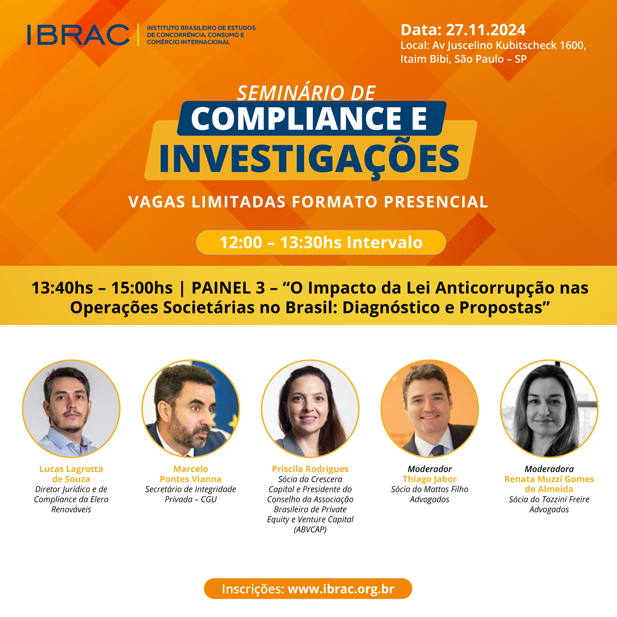 13:40hs – 15:00hs Painel 3 – “O Impacto da Lei Anticorrupção nas Operações Societárias no Brasil: Diagnóstico e Propostas”