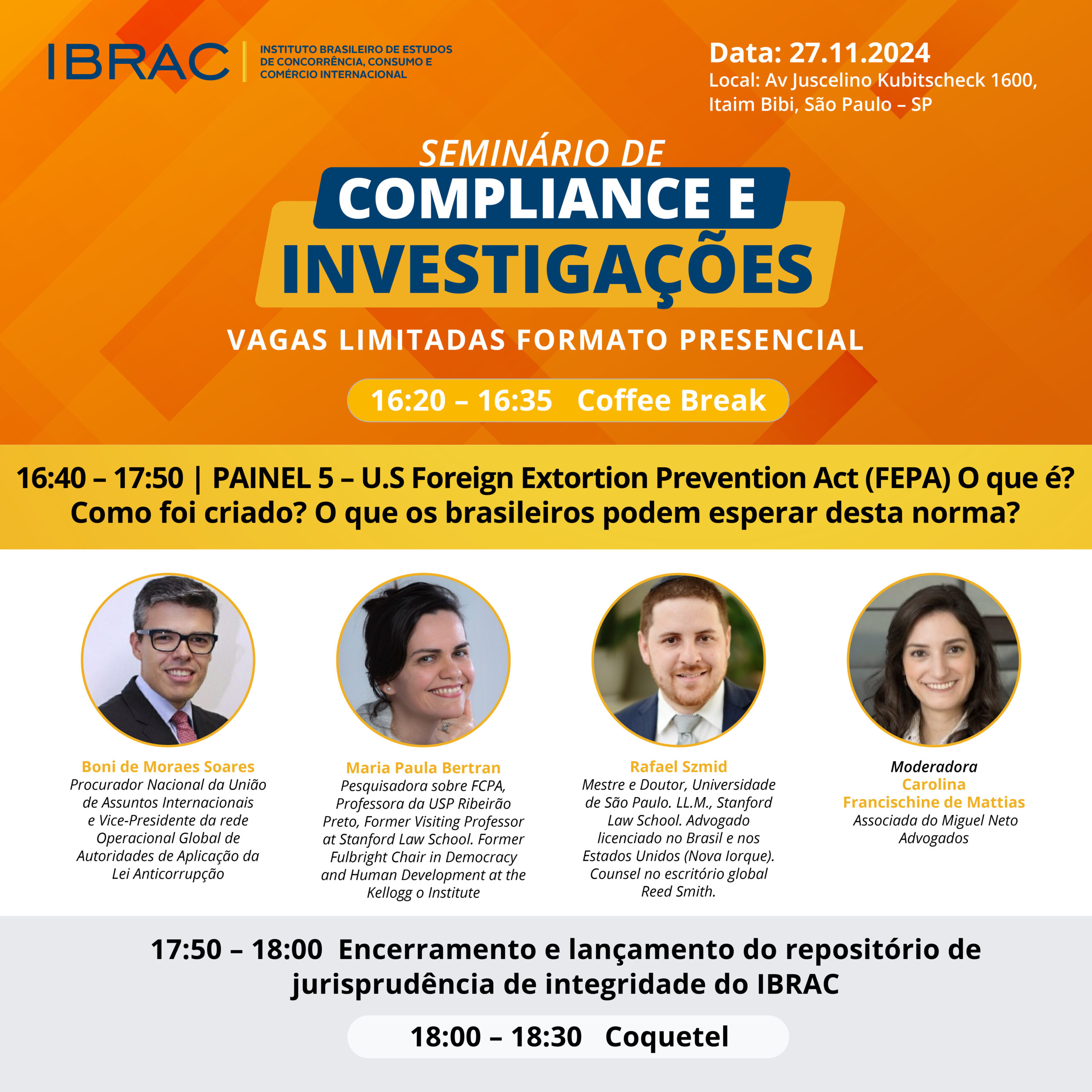16:40 – 17:50 Painel 5 – U.S Foreign Extortion Prevention Act (FEPA) O que é? Como foi criado? O que os brasileiros podem esperar desta norma?