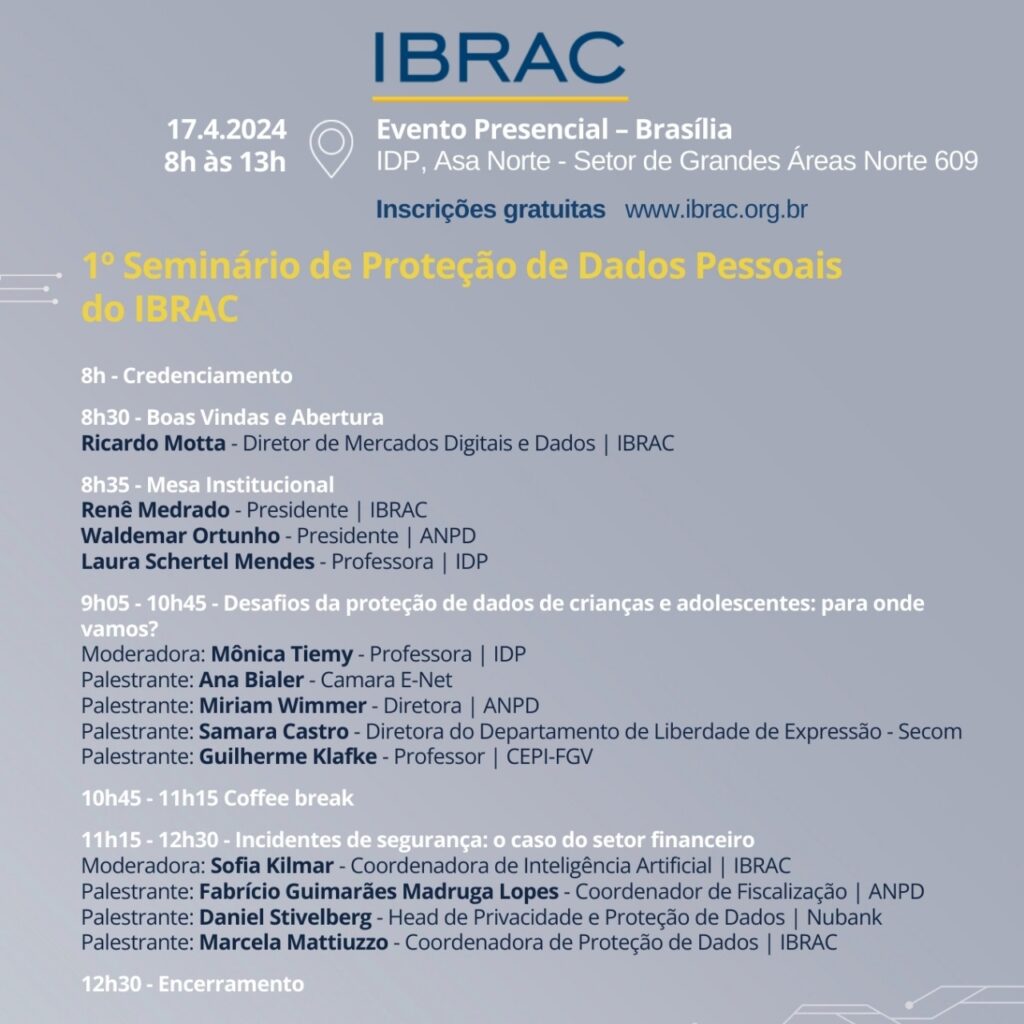 1° Seminário de Proteção de Dados Pessoais do IBRAC Interfaces entre autoridades 8h – Credenciamento 8h30 – Boas Vindas e AberturaRicardo Motta – Diretor de Mercados Digitais e Dados | IBRAC 8h35 – Mesa InstitucionalRenê Medrado – Presidente | IBRACWaldemar Ortunho – Presidente | ANPDIDP – Laura Schertel Mendes – Professora | IDP 9h05 – […]