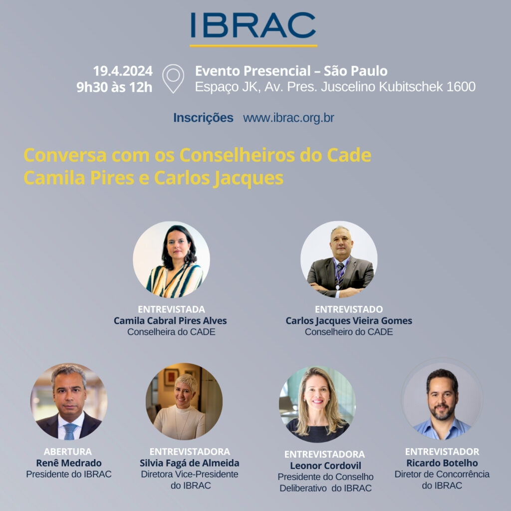 Conversa com os Conselheiros Camila Cabral Pires Alves e Carlos Jacques Vieira Gomes Presencial – Espaço JK 1600 (Av. Pres. Juscelino Kubitschek 1600, São Paulo/SP). O Comitê de Concorrência do IBRAC (Instituto Brasileiro de Estudos de Concorrência, Consumo e Comércio Internacional) pretende realizar uma série de conversas com os novos Conselheiros do Tribunal do CADE. No próximo dia […]