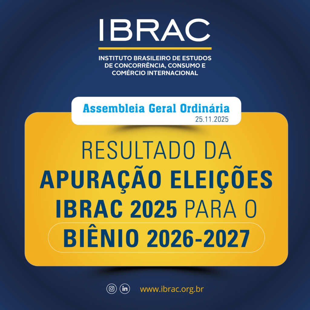 INSTITUTO BRASILEIRO DE ESTUDOS DE CONCORRÊNCIA, CONSUMO E COMÉRCIO INTERNACIONALCNPJ N.º 96.287.453/0001-10 Resultado da Apuração da Assembleia Geral Ordinária e Extraordinária Realizada em 01.12.2023, local Hotel Renaissance, Al. Santos, 2233, sala Iguaçu em São Paulo, Capital. 115votos CHAPA 1 177votos CHAPA 2 Diretora PresidentePriscila Brolio GonçalvesBrolio Gonçalves AdvogadosDiretor Vice-PresidenteMarcos Paulo VerissimoMarcos Verissimo AdvogadosDiretora de ConcorrênciaJoyce Midori […]